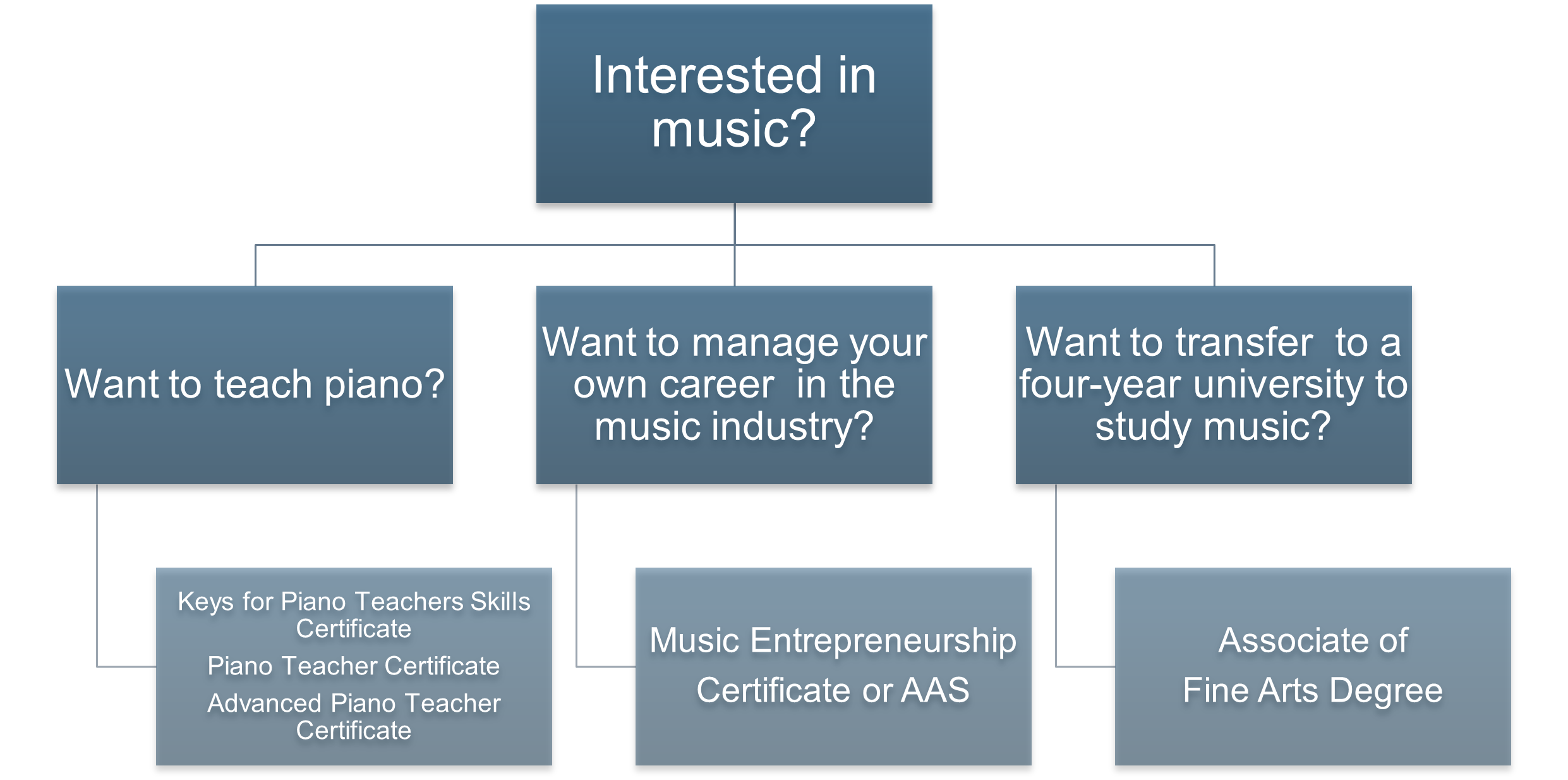 There are four certificate options to provide opportunities for students who plan to make music their profession or want to learn more about piano teaching as a career: