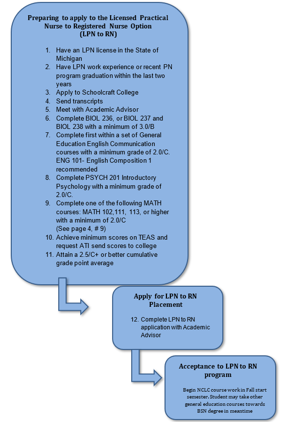 Students who may need academic testing accommodations should meet with Disability Support Services Office (734-462-4330) prior to taking the TEAS exam to determine potential accommodations. TEAS Exam attempts at Schoolcraft College must be scheduled in advance. Fees paid are non-refundable and non-transferable. Students needing to change testing dates will need to pay the full fee. Obtain more information regarding the TEAS exam: https://www.schoolcraft.edu/testingcenter/teas. | | 11. Cumulative GPA | Attain a cumulative grade point average of 2.5/C+ or better for all college-level prerequisites and supportive courses. | | 12. Apply for LPN to RN Placement | Complete the student portion of the application and meet with an academic advisor for academic planning and to sign off on the application. The advisor will submit the application and degree audit (received from Advising) to the Nursing Office. Applications are reviewed on a continual basis. The order of acceptance of qualified applicants will be based on the date the College receives a valid application for LPN to RN placement. An application is valid only if all the requirements listed in this document have been met. All prerequisites must be completed (with a final grade entered) PRIOR to submission of the application for the application to be considered for admission. In the event more than one qualified student applies on the same day, the applications will be ordered based on the highest cumulative grade point average in the prerequisite/supportive courses. Students who are accepted will receive an email confirmation indicating acceptance and the designated Fall start year. If all student spaces are full, students will be admitted to the next year’s Fall start cohort and will also be eligible to move up to the current year (depending on application date placement), if other students defer or do not meet other requirement deadlines and admission is canceled. Students who do not respond to correspondence by deadlines will be canceled by the nursing department. No students are moved up after August 1 for any given academic year. Specific information on orientation and other requirements will be sent via Schoolcraft email when available (approximately 4 months before the start semester). Students are responsible for maintaining current contact information for all college communications. Students should get their college email forwarded to their primary email so as not to miss any communications. Students may defer their admission only one time, otherwise, the student will need to reapply and meet the application requirements at that time. Students who do not meet nursing department deadlines or have been accepted to the program and then are “no call, no show” to start the program, will be canceled and not eligible to reapply to the program in the future. Admission will be canceled if students do not meet nursing department deadlines for other pre-admission requirements such as orientation and health/clinical requirements and the ability to reapply will be determined upon the nursing department’s review of the situation. | | 13. Begin NCLC course work in the Fall start semester | See the course schedule information for other general education/supportive courses required to fulfill requirements for the Associate of Applied Sciences in Nursing Degree. * These courses as listed in #14 and #15 are supportive courses that must be completed before the end of NURS 250 - Advanced Concepts in Registered Nursing (the last nursing course). It is suggested that students take the supportive courses prior to starting the nursing courses if time permits, but work with an academic advisor to develop a plan to complete these courses. | | 14. Humanities* | Select General Education Humanities course with a minimum grade of 2.0. | | 15. English Communication* | Select second within a set of General Education English Communication courses with a minimum grade of 2.0. | OPTIONAL COLLEGE SUCCESS COURSE AND/OR NURSING PHARMACOLOGY COURSE