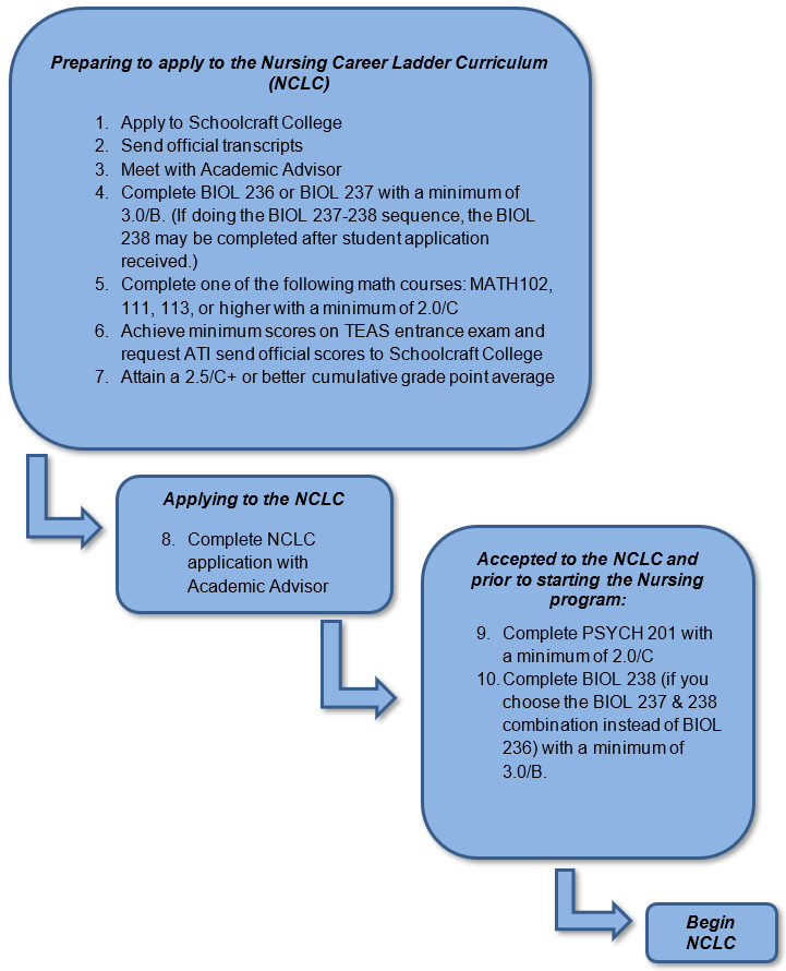 Preparing to Apply to the Nursing Career Ladder Curriculum (NCLC) | 1. Apply to Schoolcraft College | Apply to Schoolcraft College online at https://www.schoolcraft.edu/admissions/apply-to-sc/. | | 2. Transcripts | It is recommended you request official undergraduate transcripts from all colleges and universities previously attended. Transcripts must be sent directly from the issuing college or university to the Schoolcraft College Record’s Office. To confirm that transcripts have been received, contact the Answer Center & Help Line at 734-462-4426. | | 3. Advising | The nursing program requires minimum assessment levels of coursework in the areas of math, reading, and writing. Students should meet with an academic advisor to develop an academic plan. Students with prior college-level work or a degree may be exempt from general college placement testing. Students who have submitted ACT or SAT scores that are less than three years old to the Records Office may also be exempt from assessment testing. Contact the Academic Advising Center at 734-462-4429 to make an appointment to discuss an academic plan and preparation for the TEAS (nursing entrance) exam. Nursing students should possess and maintain the following to be able to adequately communicate, make decisions, manipulate equipment, perform procedures, and provide indirect or direct quality care for clients in a variety of healthcare settings: - Sufficient intellectual, psychological, and emotional capabilities